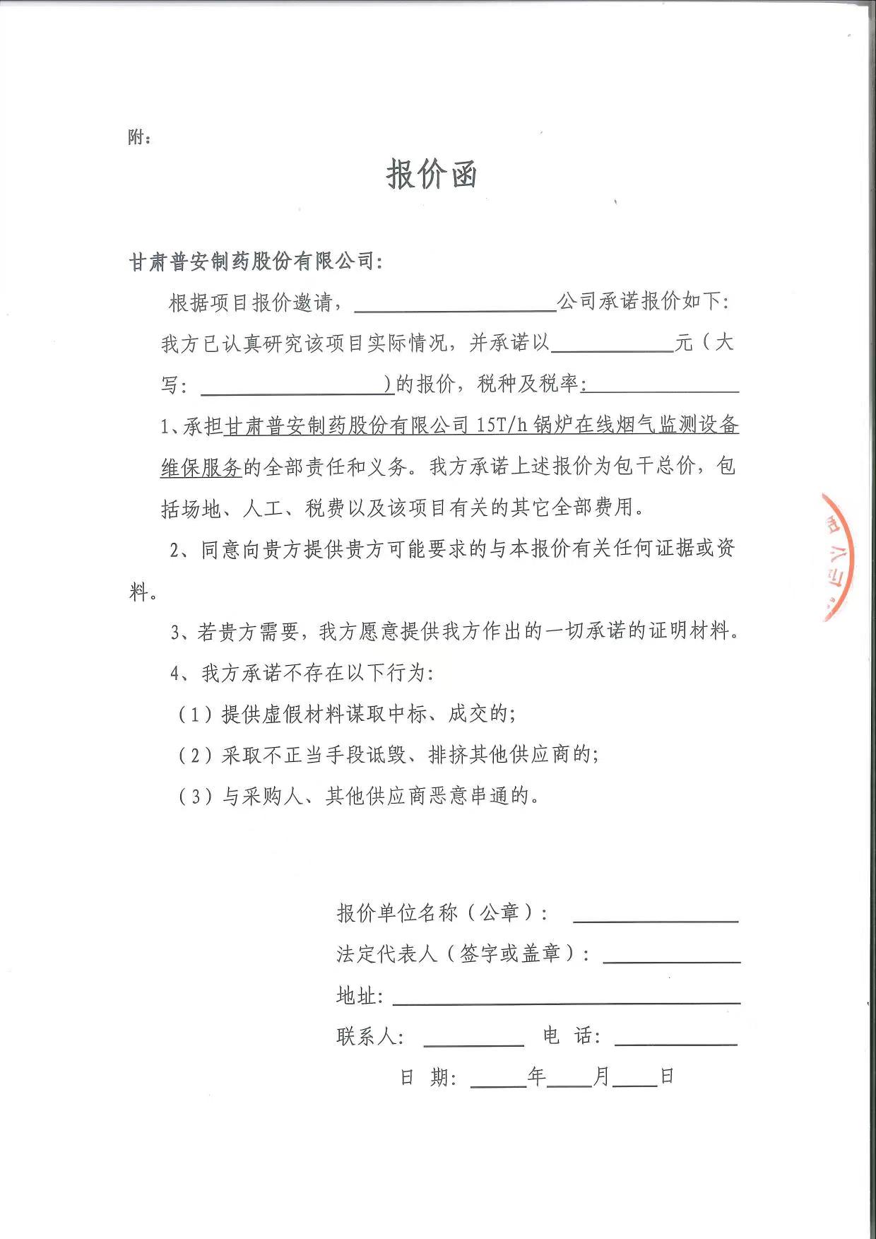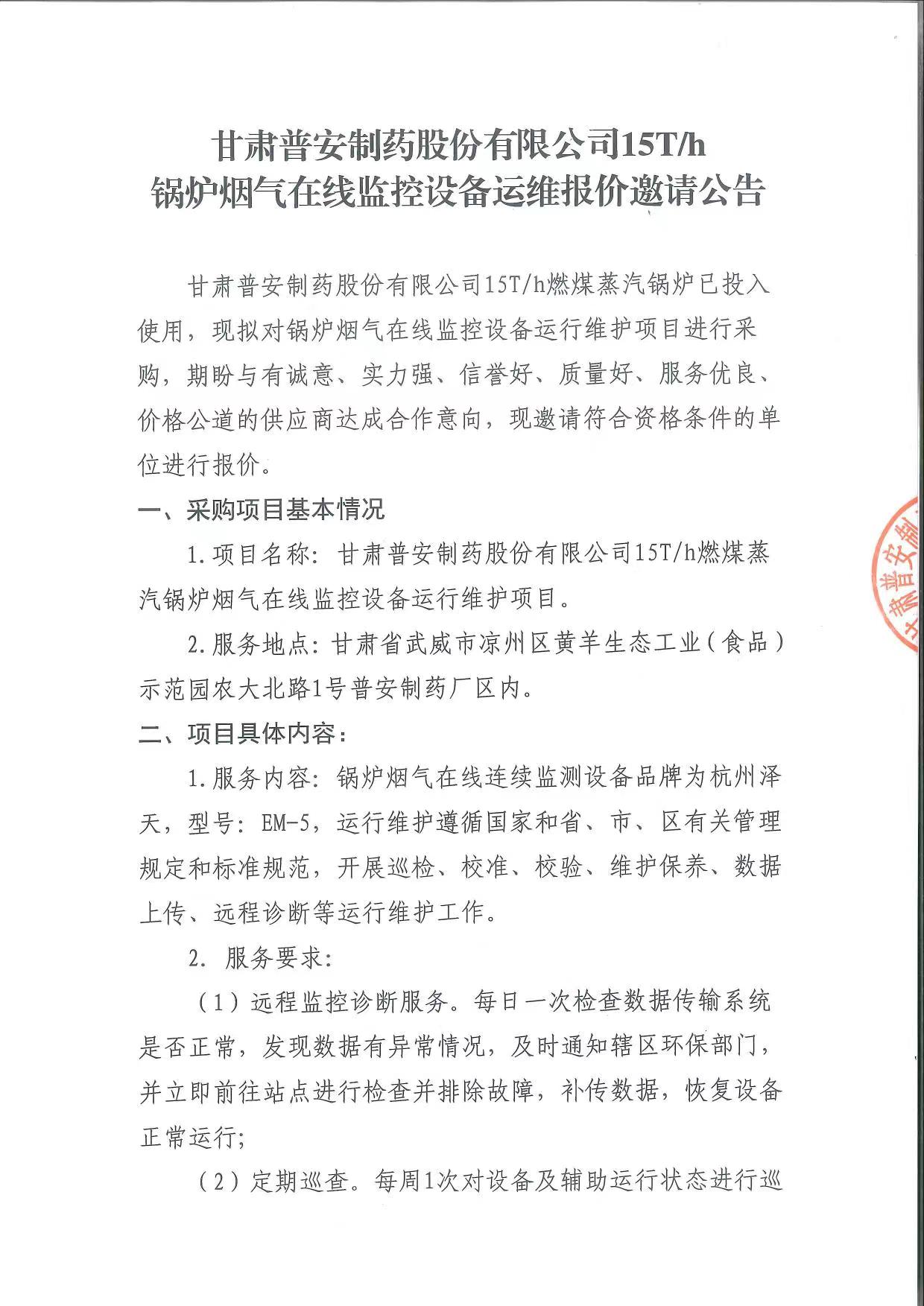 甘肅普安制藥股份有限公司15T/h鍋爐煙氣在線監控設備運維報價邀請公告