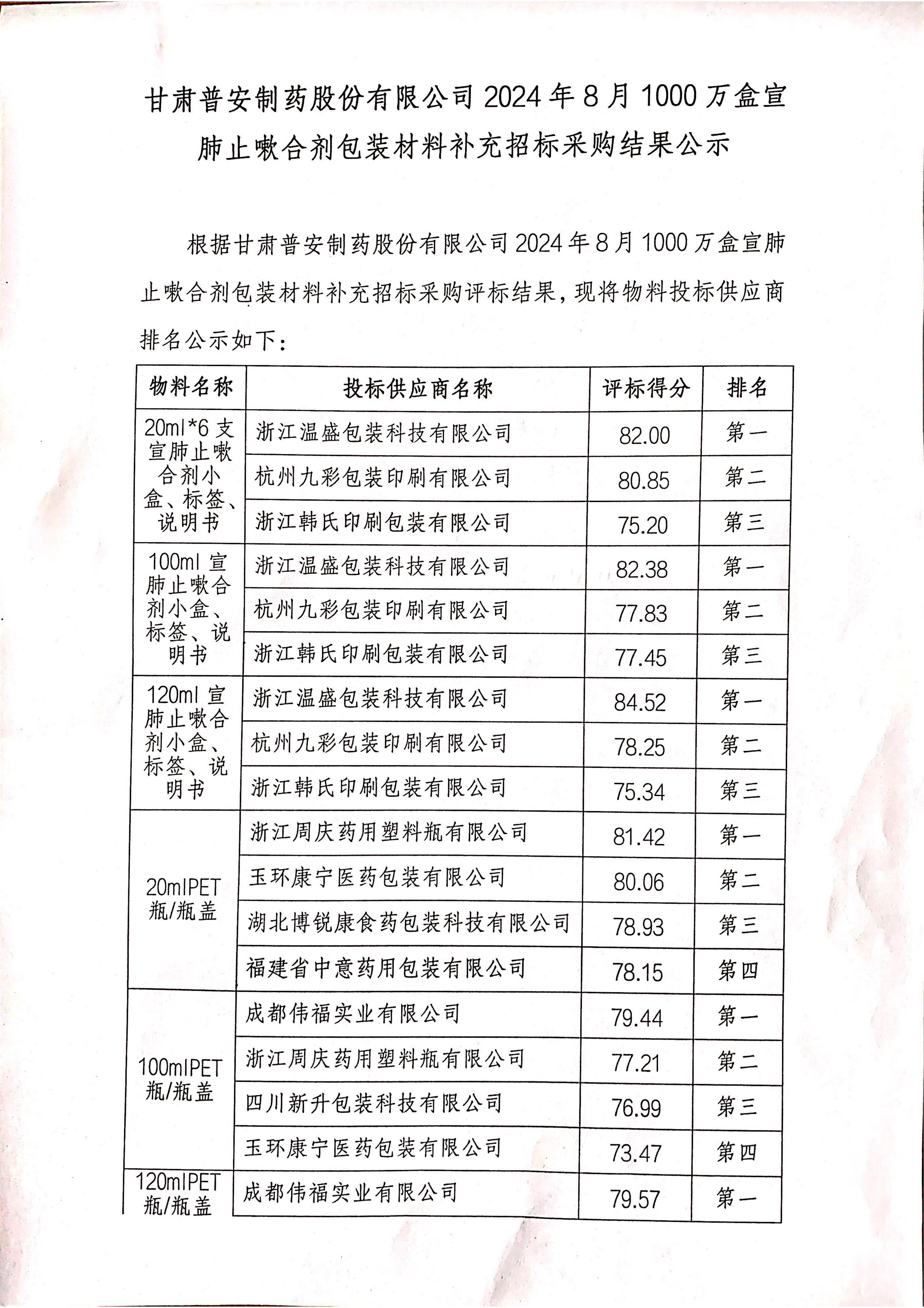 甘肅普安制藥股份有限公司2024年8月1000萬(wàn)盒宣肺止嗽合劑包裝材料補(bǔ)充招標(biāo)采購(gòu)結(jié)果公示